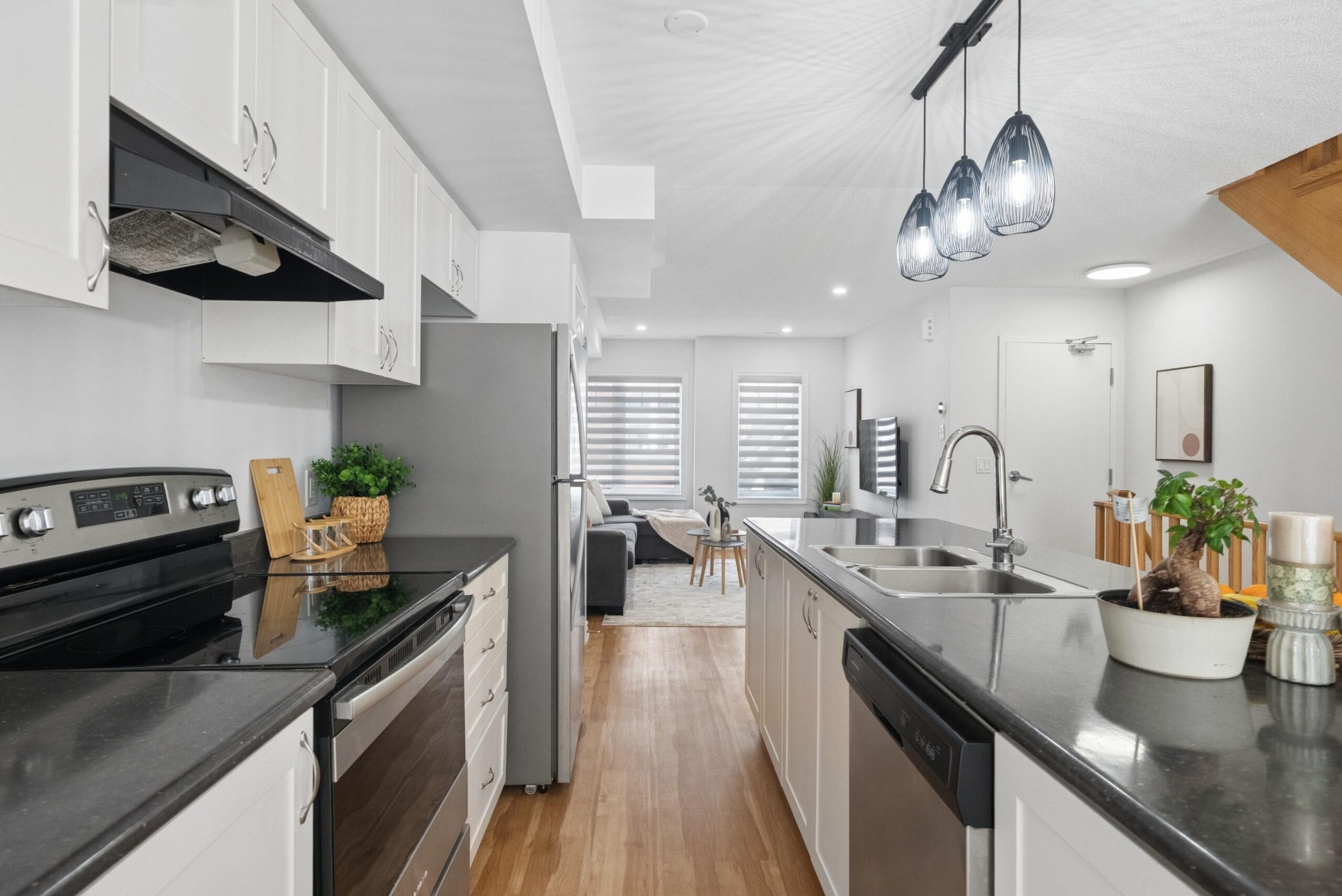 The open-concept main floor is designed for everyday living and entertaining, showcasing a modern kitchen with a large centre island, breakfast bar, pantry, and stainless steel appliances. The sun-filled great room features expansive windows, while the dining area walks out to a private terrace—perfect for relaxing or hosting. A convenient 2-piece powder room completes the main level.